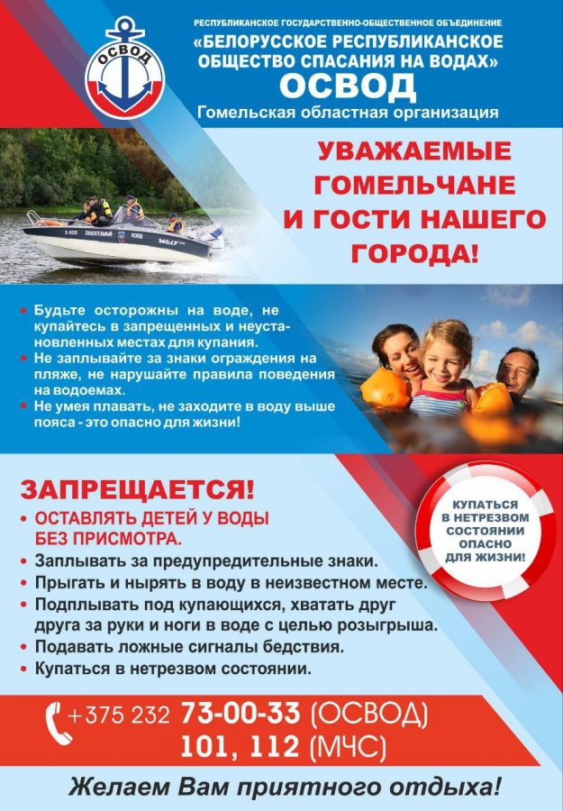 Спасатели ОСВОД напоминают, что вода может быть замечательным другом, но может и стать источником серьезной опасности. Отправляясь на отдых вблизи водоёмов,ЗАПРЕЩАЕТСЯ: 1. Купаться в запрещенных местах рек, озер, водохранилищ, прудов и иных водоемов (ст. 24.42 КоАП РБ)2. Загрязнять и засорять водоемы (ст. 16.34 КоАП РБ)3. Распивать спиртные напитки, входить в воду и купаться в нетрезвом…