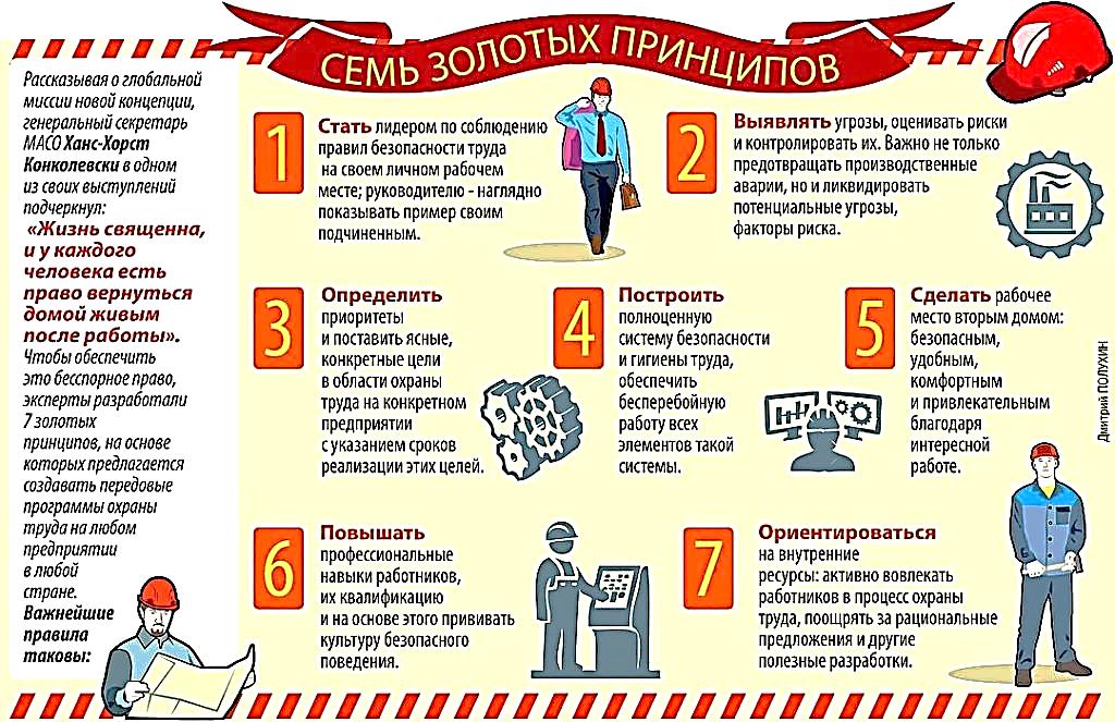 Концепция «Vision Zero» предлагает семь «золотых правил», реализация которых будет содействовать работодателю в снижении показателей производственного травматизма и профессиональной заболеваемости. Следование каждому из этих правил предполагает серьезную организационную работу и применение специального инструментария, позволяющего достичь поставленных целей.