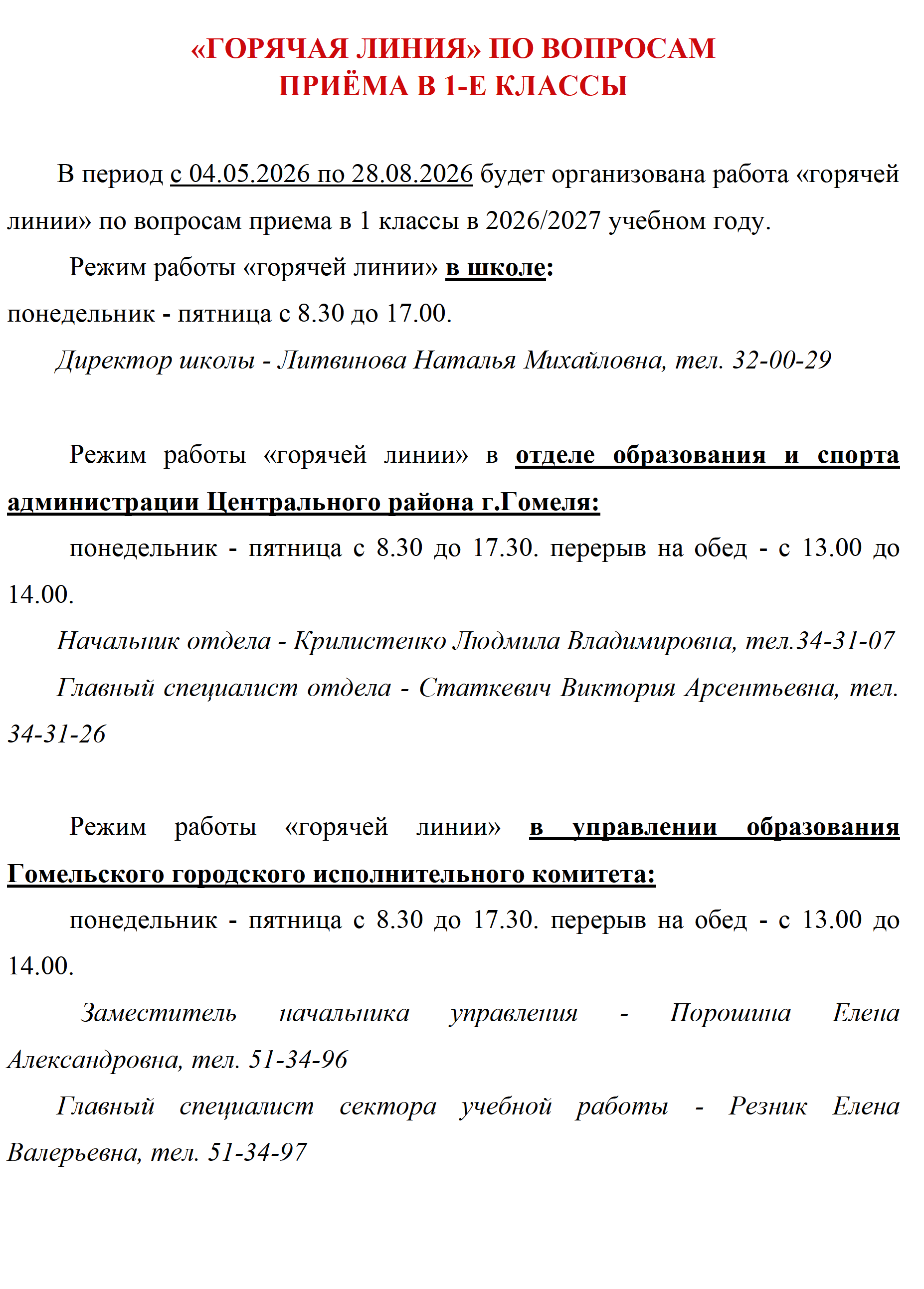 С 12 мая 2026 года будет открыта запись на приём к директору на 17 июня 2026 года для подачи заявления в 1-й класс. Записаться можно по телефону 8 0232 32 00 35 (приёмная) с 09.00 до 17.00.