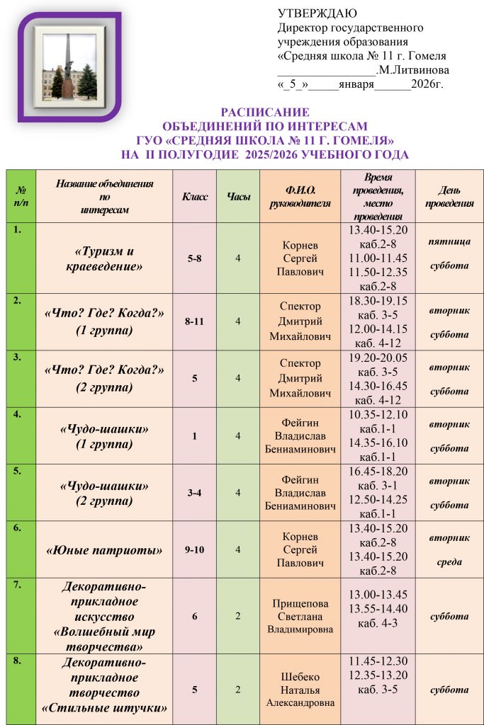 РАСПИСАНИЕ объединений по интересам (6 день) ГУО «Средняя школа № 11 г. Гомеля» на II полугодие 2025/2026 учебного года РАСПИСАНИЕ объединений 2 полугодие 26 с 25.02
